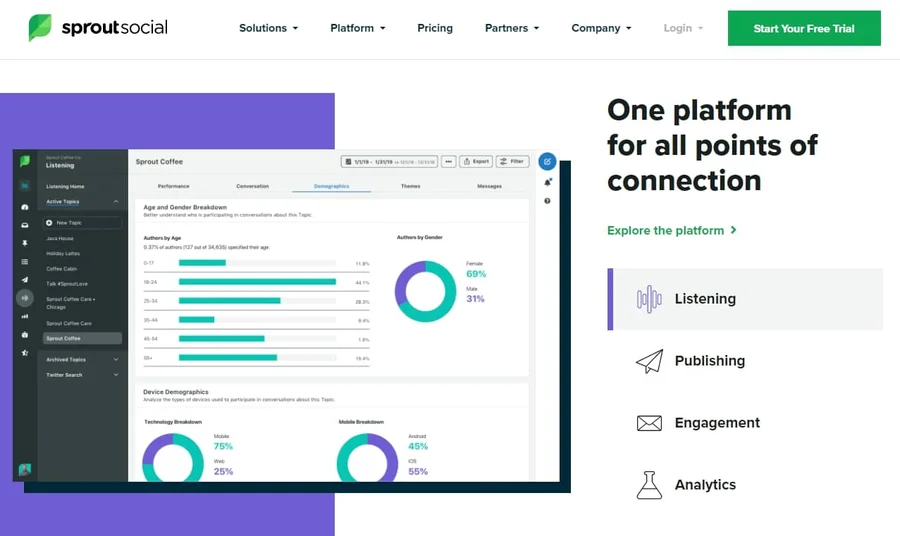 Descripción: Sprout Social es otra solución de administración social todo en uno. Se integra con su CRM y proporciona funciones de soporte con capacidades de informes. Un buen equilibrio entre la administración de cuentas (como la escucha social y el trabajo con personas influyentes) y el análisis se considera un punto dulce para muchas empresas y sus gerentes de redes sociales.