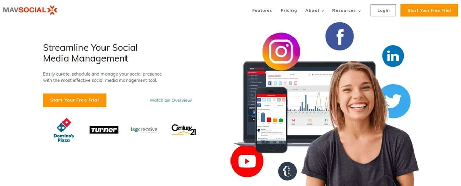 Descripción: MavSocial se centra en múltiples aspectos de administración de redes sociales, como publicar (programar, automatizar e impulsar), escuchar (rastrear, filtrar y actuar), participar (ver, ordenar y responder), informar (supervisar, analizar y exportar), colaborar (administración de equipos y auditoría) y comisariar (descubrir, administrar y editar).