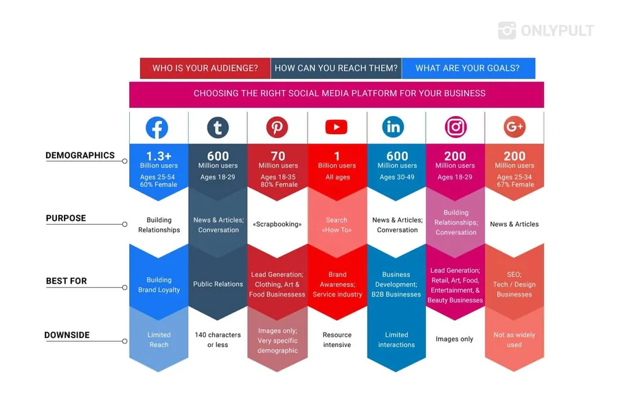 Ya hemos mencionado brevemente que cada canal de redes sociales y messengers resuelven objetivos ligeramente diferentes para su cuenta comercial en particular. Mire cada red individualmente y decida en qué dirección desea ir. Los objetivos deben ser útiles, realistas y rastreables, y aquí hay algunos de los más comunes que persiguen la mayoría de las cuentas comerciales: