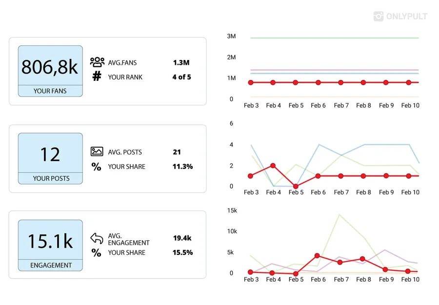 Ya sea que esté apuntando a una sola plataforma o necesite una solución integral, la herramienta adecuada puede brindarle respuestas analíticas que usted necesite. Por ejemplo, puede usar la función de análisis de Onlypult haciendo clic en la pestaña correspondiente. Aquí encontrará el número de publicaciones, el número total de likes, comentarios para un período de tiempo seleccionado, el número promedio de likes por publicación y el número promedio de comentarios por publicación.