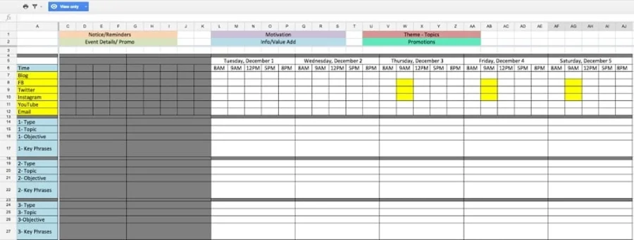 La mejor manera de organizar un plan de redes sociales es crear un calendario de contenido. Puede utilizar Hojas de cálculo de Google, hojas de cálculo de Excel o un servicio especializado. Todas las actividades se pueden dividir en categorías basadas en: