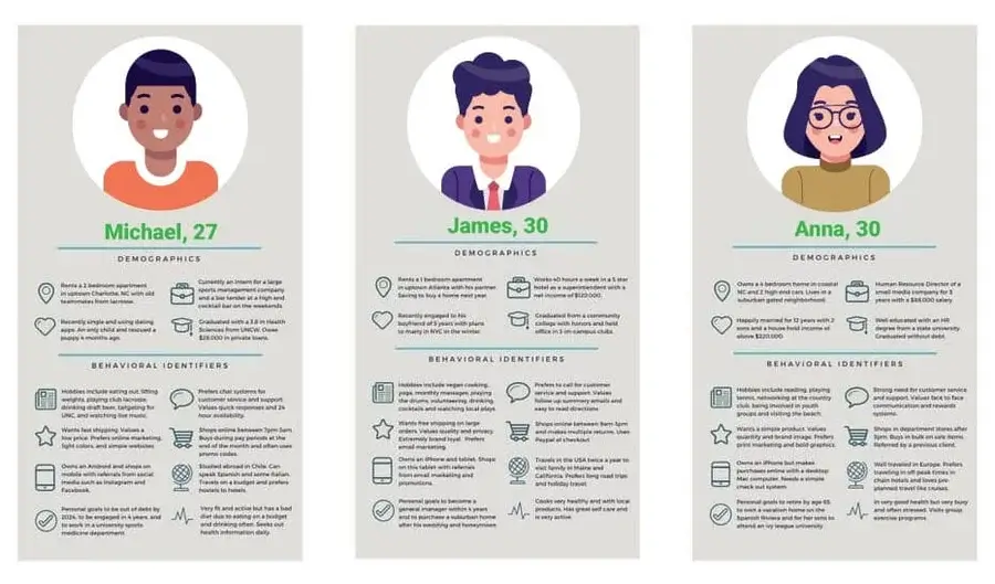 Cree un retrato de los suscriptores de los principales grupos objetivo de su audiencia. Le ayuda a entender cada segmento de su base de clientes sin agruparlos todos juntos. Este método se basa en determinar las necesidades y deseos específicos de su cliente.