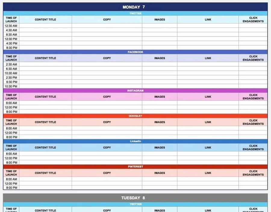 La última plantilla se centra principalmente en el tiempo. Si el gerente calculó con precisión el mejor momento para publicar en diferentes plataformas, este plan funcionará muy bien. Especifica quién está a cargo en un día determinado, de qué se trata el contenido y cualquier otra cosa a la que el administrador necesite acceder rápidamente.