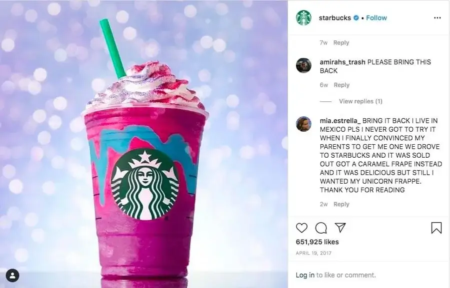 Por ejemplo, eche un vistazo a la bebida unicornio Starbucks. El lanzamiento de este Frappuccino hizo muchos titulares y se ganó los corazones de la audiencia más joven de Starbucks. Solo estuvo disponible durante una semana y generó casi 155,000 publicaciones en Instagram durante ese tiempo. Starbucks aprovechó la tendencia y se enfocó fuertemente en los respost de contenido generado por el usuario.