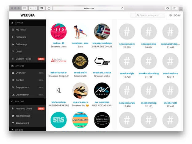 La búsqueda de hastags en Websta con la palabra “sneakers”.
