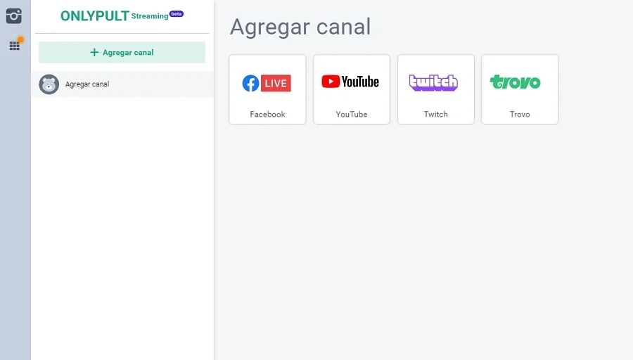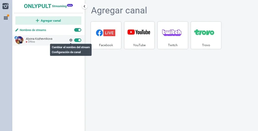 Usted verá el menú después de abrir “Stream”. Aquí necesita agregar uno o más de sus canales en Facebook, YouTube, Twitch (otras plataformas se agregarán más adelante).