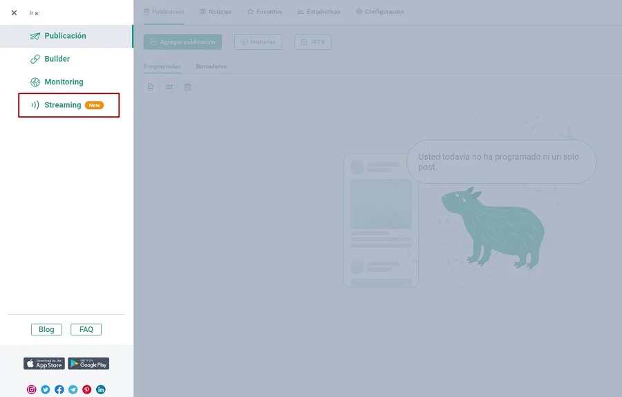 Luego verá el panel de control para publicar. Haga clic en el icono debajo del logotipo y verá un menú en la izquierda, donde se mostrarán 4 productos Onlypult, incluido Streaming.