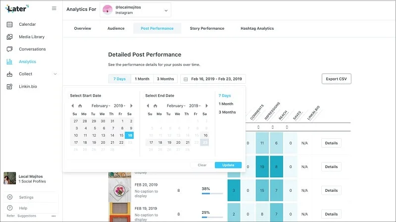 El último en nuestra lista de programadores y plataformas de redes sociales es Later. Es ideal para Instagramers pero menos para aquellos que prefieren centrarse en otras plataformas sociales. Si estás administrando otras redes sociales, es posible que necesites encontrar una combinación perfecta de herramientas o simplemente usar otra.
