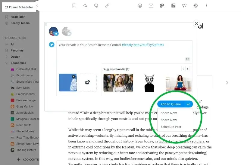 Es importante mencionar que Feedly no es conocido por sus funciones de programación impecables. Sin embargo, lo compensa con otras funciones, como la selección automática de contenido para llenar su calendario de redes sociales. También ofrece integraciones útiles para ampliar aún más su funcionalidad.