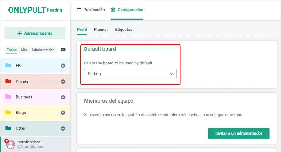 El pin se publicará en el tablero que establezca de forma predeterminada en la configuración de su cuenta de Pinterest (consulta “Cómo seleccionar un tablero”).