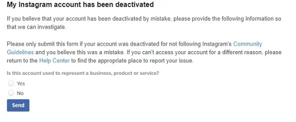 Si cree que su cuenta fue bloqueada por error, haga clic en el botón Reportar. Usted verá un barrra con una pregunta: “¿Esta cuenta se utiliza para representar un negocio, producto o servicio?”. Ya sea que tenga una cuenta comercial o personal, debe presionar el botón No.