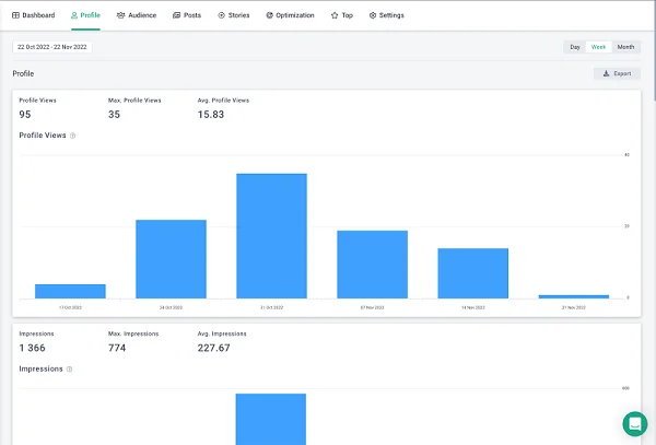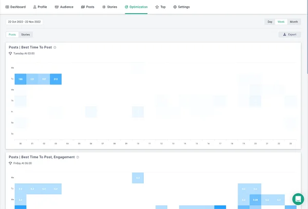 El valor de estos datos no se puede sobreestimar. Por ejemplo, antes de publicar, un especialista en SMM generalmente necesita analizar cuándo la actividad del usuario es mayor, qué etiquetas ayudan a la publicación a llegar a la página de recomendaciones, con qué frecuencia se necesita la actividad y otras métricas. Es difícil, a menudo requiere mucho tiempo y, debido al factor humano, no garantiza la objetividad. La sección “Optimización” ayuda a abandonar por completo la rutina: para averiguar todo lo que necesita, simplemente vaya a la pestaña correspondiente, donde todos los gráficos se pueden monitorear en paralelo.