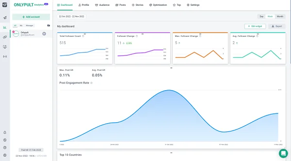 Además de esto, Onlypult también ha implementado el servicio Estadísticas, una herramienta que le permite monitorear el alcance y el crecimiento de sus seguidores, saber siempre el mejor momento para hacer publicaciones, determinar los hashtags más populares, generar informes sobre el trabajo realizado y recibir más información importante. Obtenga más información sobre esta herramienta a continuación.