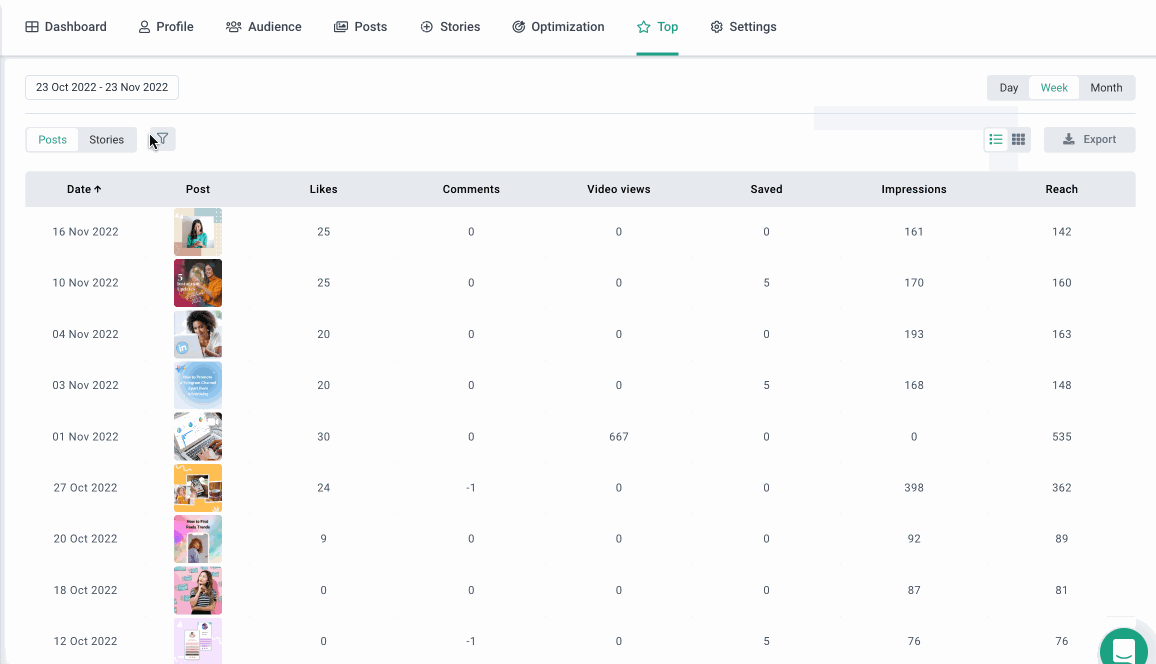 Es una sección en la que usted puede ver toda la información sobre las publicaciones de la cuenta: cuántas veces se ha visto la publicación, cuántos likes y comentarios recibe y con qué frecuencia se guarda, qué tasa de participación tiene y otros datos.