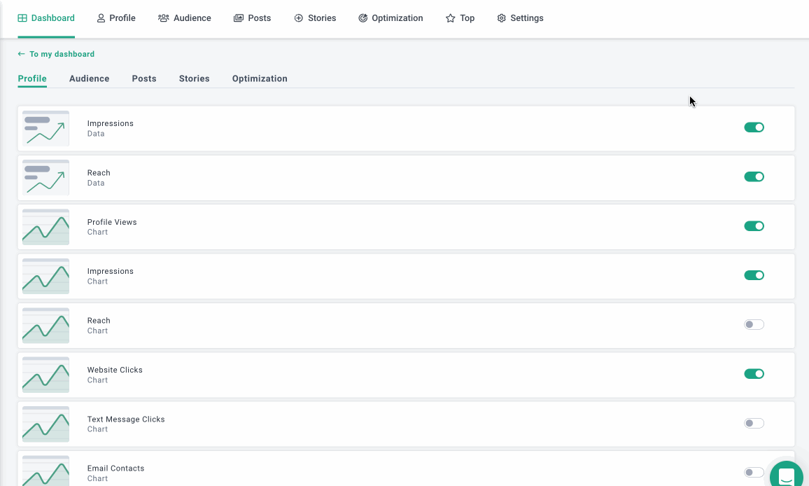 - Los gráficos se pueden personalizar. Usted puede seleccionar los parámetros para recopilar y organizarlos en el orden deseado; no es necesario recopilar métricas que no le interesen. El dashboard será la forma en que lo necesita, es más conveniente e informativo que trabajar con estadísticas estándar de Instagram.