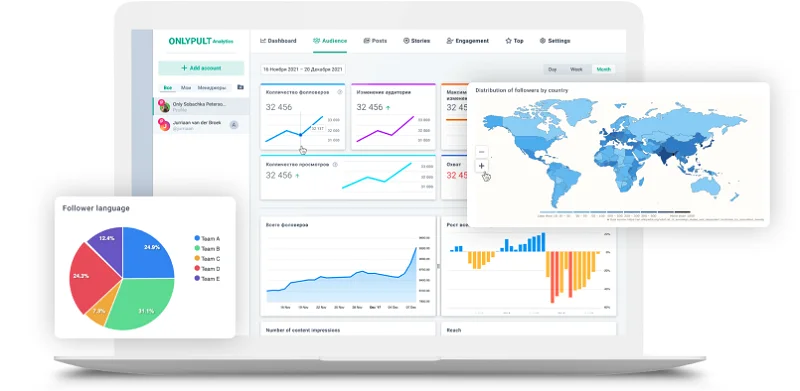 Para las cuentas comerciales, Instagram ha implementado un gran conjunto de herramientas para rastrear el rendimiento de la página. Pero incluso ellos no le permiten ver todos los detalles y rastrear todos los patrones de acciones de los seguidores. Onlypult Estadísticas resuelve estos problemas. Nuestro servicio también tiene otros beneficios.