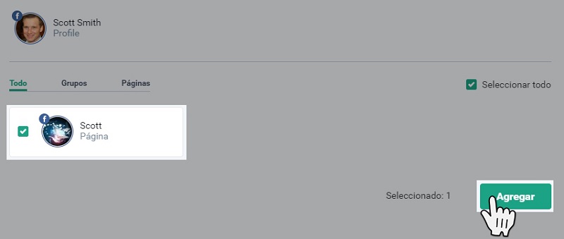 - Después de conceder todos los derechos relacionados, el servicio le abrirá la lista de todas las páginas a las que tiene acceso. Seleccione todas las páginas que desea agregar y pulse “Agregar”.