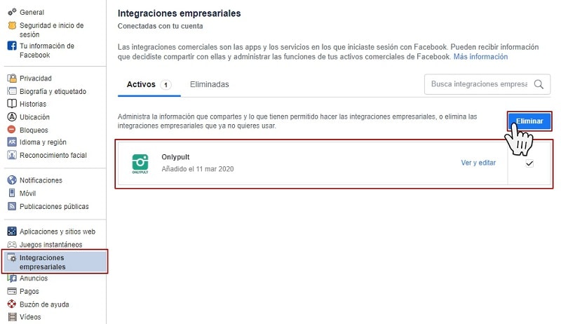 Seleccione la aplicación en la sección “Integraciones empresariales” y pulse “Eliminar”.