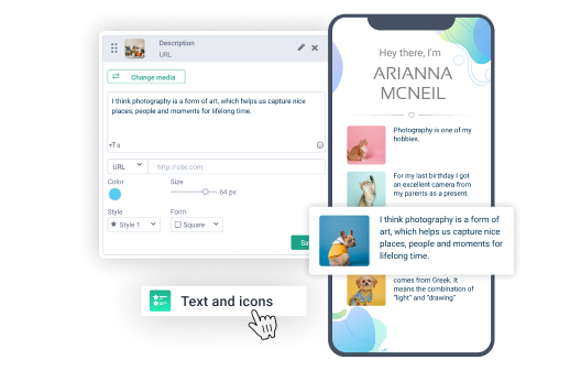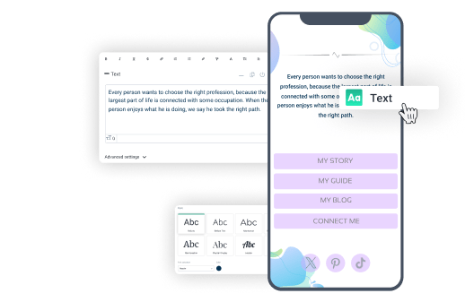Diseñe textos con un editor multifuncional incorporado y cree títulos atractivos y descripciones legibles en cualquier área de la página. Utilice la biblioteca de fuentes y cargue sus propias fuentes.