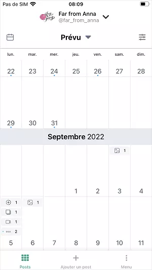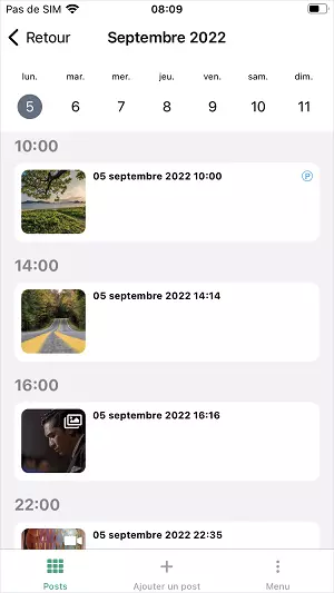 Appuyez sur la cellule de date pour avoir un aperçu de tous les posts programmés pour cette date. En appuyant sur la cellule de date, vous activez la vue hebdomadaire :