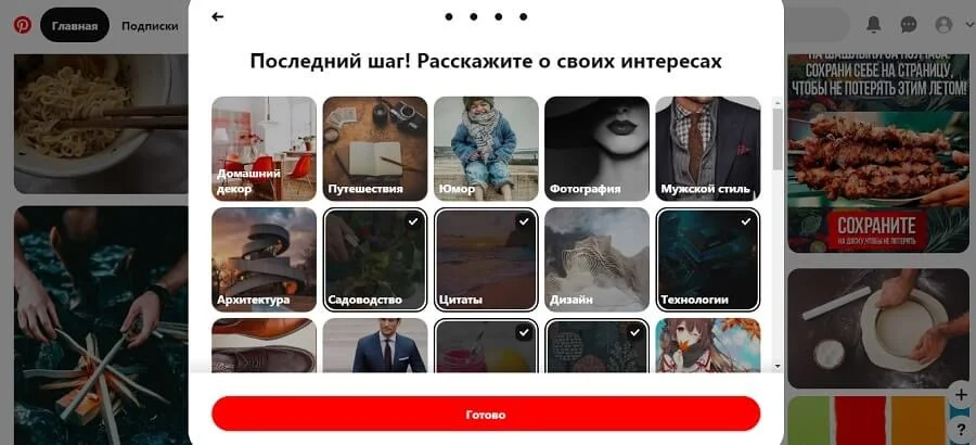 PPinterest adapte les débutants à leur produit avec une série de 4 pop-ups interactifs. Ces étapes visent à personnaliser l’expérience des utilisateurs et à créer un environnement confortable pour leur travail ultérieur. De cette manière, l’équipe Pinterest montre qu’elle se soucie des premières impressions des utilisateurs sur la plate-forme.
