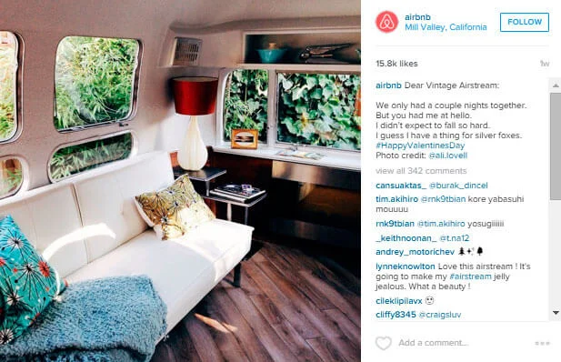 Un des trucs – est d’écrire les lettres-publications de la part de l’utilisateur. “Dear Vintage Airstream: We only had a couple nights together. But you had me at hello”. L’interaction avec l’utilisateur joue un rôle important – chaque troisième publication dans le compte a le lien sur l’abonné dans Instagram, qui a utilisé la préstation du service.