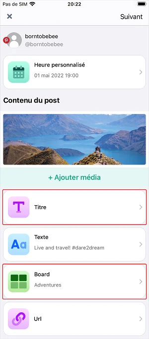 Publication sur Pinterest. Sélection du tableau et le champ Titre