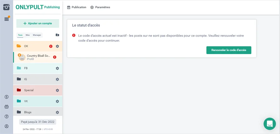 Si votre code d’accès de profil social OK est perdu ou expire, Onlypult vous en informe lorsque vous essayez de programmer une publication. Vous devez cliquer sur un seul bouton pour renouveler le code d’accès et continuer la publication :