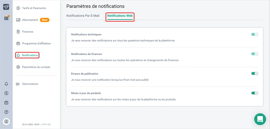 Vous pouvez activer/désactiver la réception de notifications de différents types dans les paramètres de votre compte :