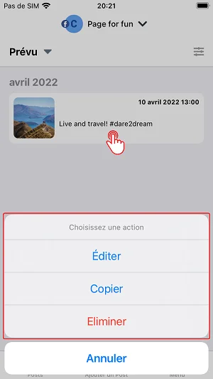 Le menu s’affiche également lorsque vous cliquez sur le post de l’une de ces listes : Prévus, Publiés, Brouillons et Erreurs :