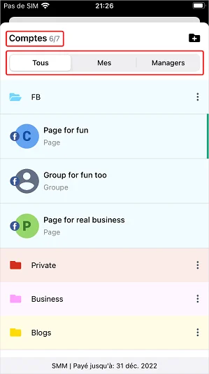 En basculant entre les onglets en haut de la liste, vous pouvez filtrer vos comptes et ceux auxquels vous avez accès en tant que manager.