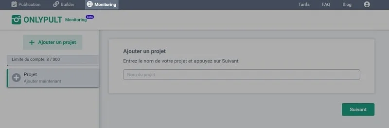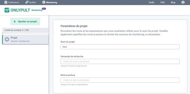 Tout tarif de publication Onlypult permet d'utiliser les fonctionnalités de Monitoring, mais avec certaines limitations comme dans le cadre du tarif FREE. Vous pouvez également acheter un tarif de Monitoring, qui comprend des fonctionnalités supplémentaires, si vous allez dans la section Tarif. |