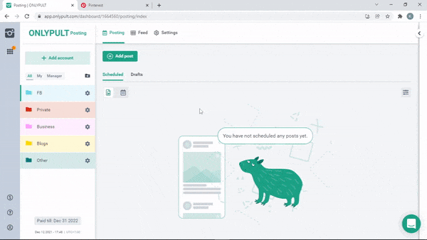 Connectez-vous à votre compte Pinterest que vous souhaitez ajouter à Onlypult. Cliquez ensuite sur + Ajouter un compte, sélectionnez Pinterest, puis cliquez sur Donner accès dans la fenêtre qui apparaît. C’est tout! Le compte a été ajouté.