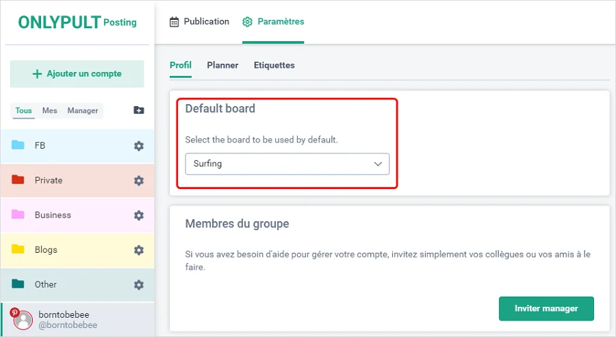 Le board affiché ici par défaut est celui que vous avez défini dans les paramètres de votre compte Pinterest: