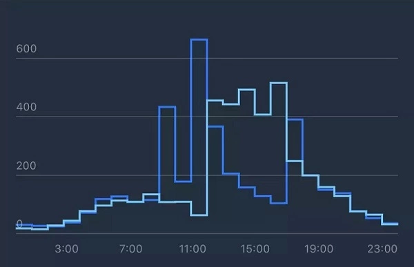 A l’aide du graphique suivant, vous pouvez voir l’heure de la journée où vos publications sont consultées le plus activement. Ici vous pouvez également trouver un taux hebdomadaire moyen. Il y a deux lignes sur le graphique : l’une représente les informations sur la semaine en cours, l’autre sur la semaine dernière.