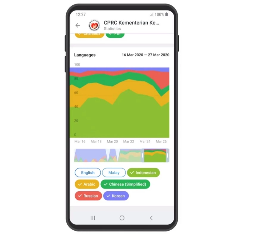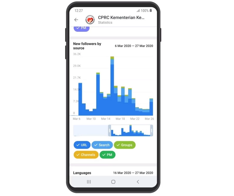 Ici, vous pouvez savoir quelle langue d’interface est installée sur le Telegram de vos utilisateurs. Les données sont présentées sous forme de diagramme. Vous pouvez désactiver certaines langues et afficher des statistiques quotidiennes et hebdomadaires.