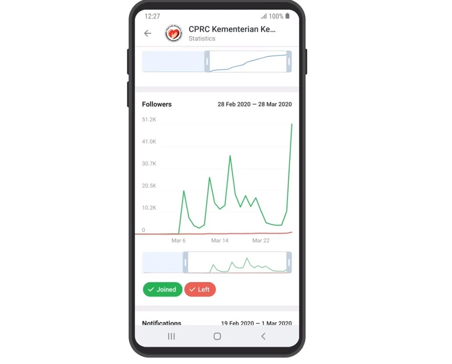 Le graphique montre le résultat de la promotion de posts. Il indique également si votre publication est devenue virale et est activement ajoutée aux chats et aux groupes.