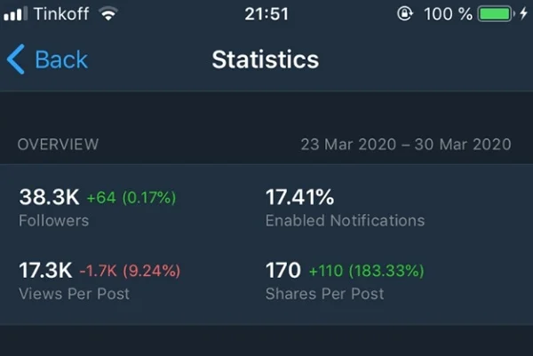 Les statistiques ne sont disponibles que pour les administrateurs des chaînes avec plus de 1 000 abonnés. Pour afficher les informations, l’administrateur doit être autorisé à faire des publications.