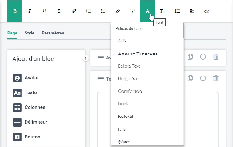 - Nous avons ajouté de nombreuses nouvelles polices* pour le texte de votre page. De plus, vous pouvez ajouter jusqu’à 10 polices par vous-même: