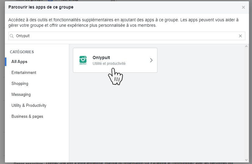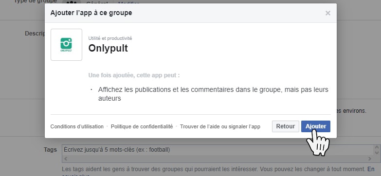- Spécifiez notre application dans les paramètres du groupe Facebook