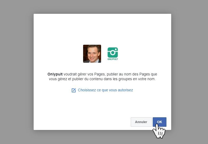 - Ensuite, une fenêtre apparaîtra vous proposant d’octroyer les droits à l’application pour gérer vos pages, publier au nom de votre page et publier sur des groupes en votre nom.