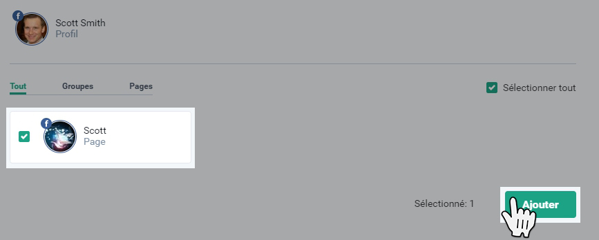 - Après avoir attribué tous les droits associés, le service ouvre la liste de toutes les pages auxquelles vous avez accès. Sélectionnez toutes les pages que vous souhaitez ajouter et appuyez sur “Ajouter”.