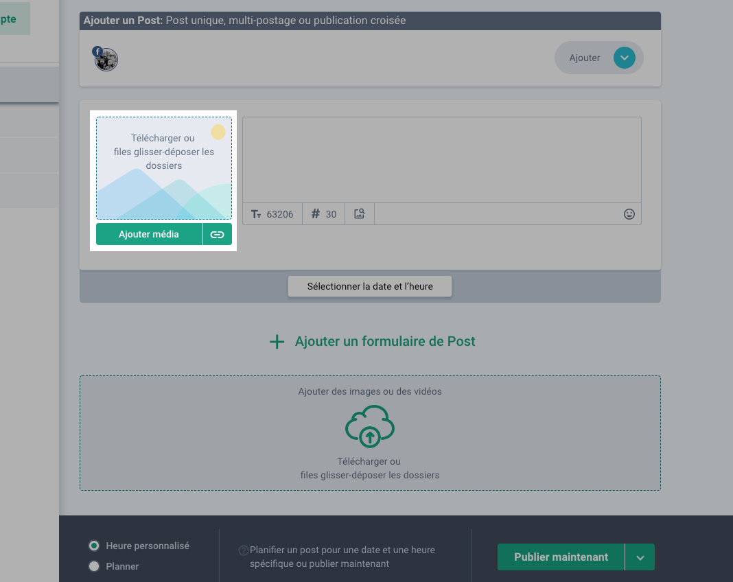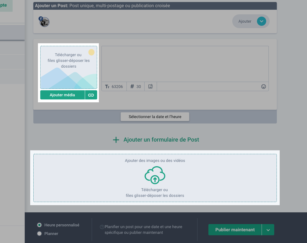 Pour ajouter une photo ou une vidéo, vous pouvez appuyer sur Ajouter média ou faire glisser des fichiers dans le champ en pointillé.