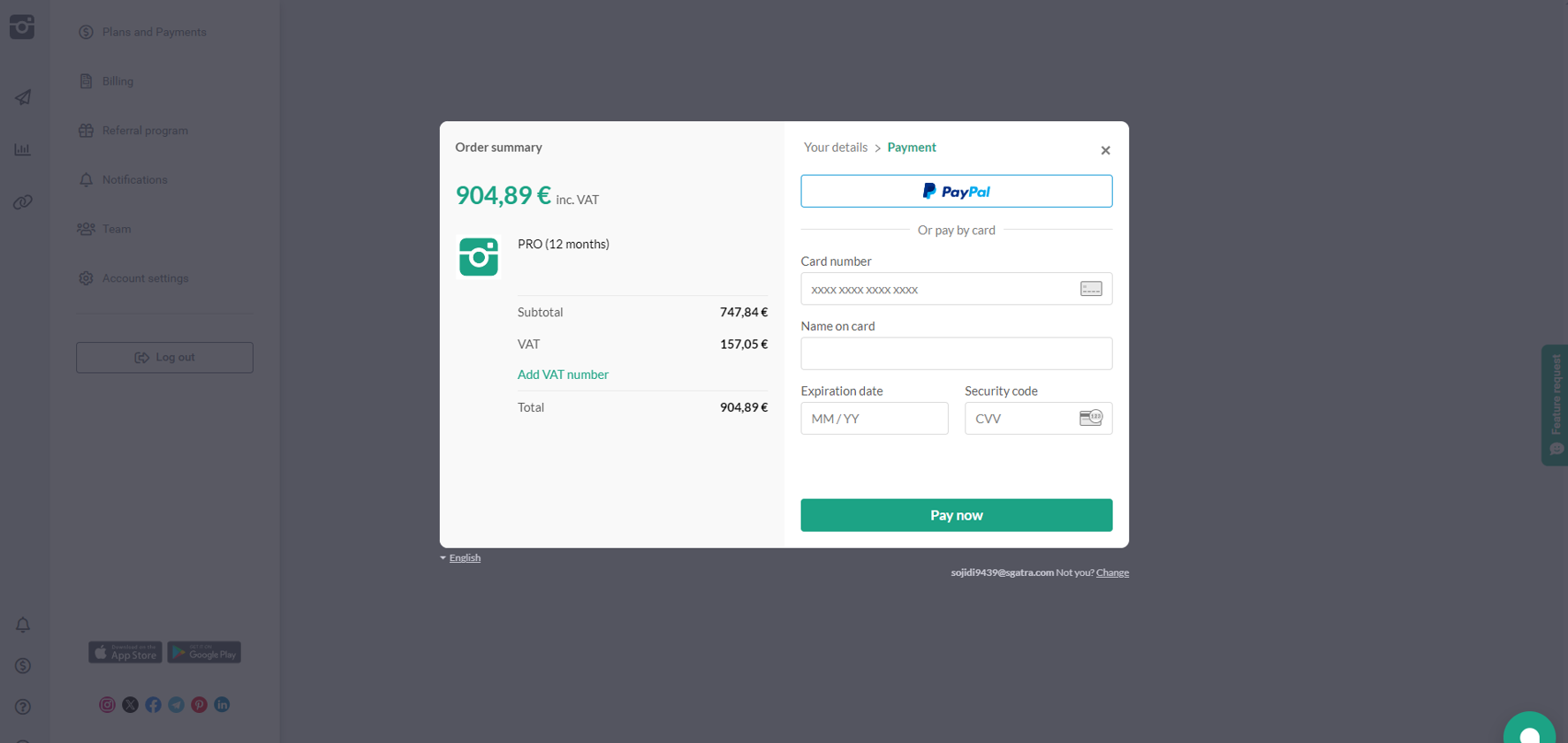 En choisissant le système de paiement Paddle.com, vous pouvez régler le tarif par carte bancaire ou depuis votre compte PayPal. Dans ce cas, le montant de l’impôt indirect peut être automatiquement ajouté au montant du paiement.