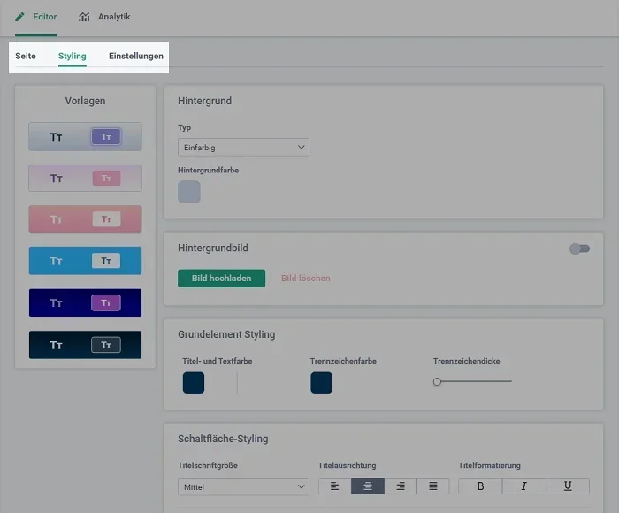 Quando si lavora con una pagina, è possibile passare facilmente tra le impostazioni principali e la scheda di design tramite pannello a schede.