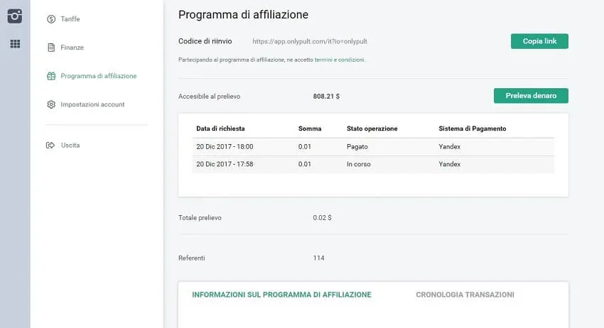 Tutte le informazioni sul programma referral sono disponibili nella sezione speciale. Qui puoi trovare i termini e le condizioni del programma, tutte le operazioni, il numero dei tuoi referenti e il denaro disponibile per il prelievo.