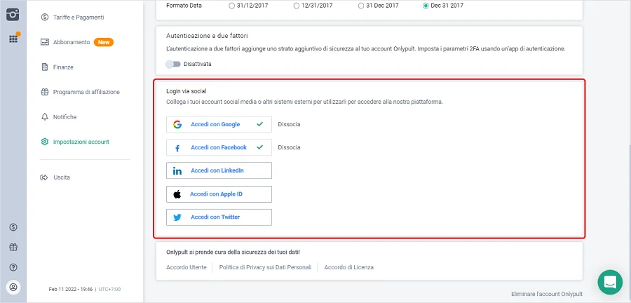 Impostazione di accedere all’account Onlypult tramite piattaforme di social media