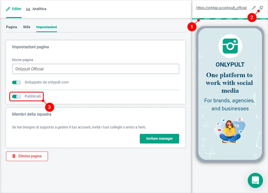 - Abbiamo spostato l’interruttore di pubblicazione della pagina sulla scheda Impostazioni (3).