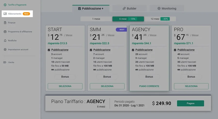 È possibile attivare un abbonamento nella sezione “Abbonamento”. I dati di pagamento dell’abbonamento verranno salvati nella sezione “Finanza”.