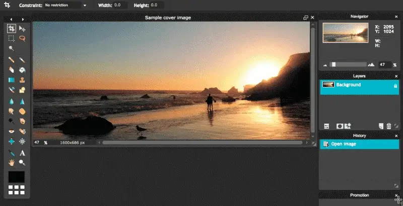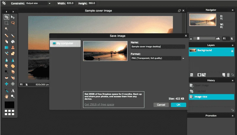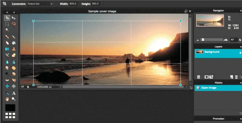 Passo 3. Passa dalla scheda “Constraint” a “Output size” e imposta la larghezza e l’altezza rispettivamente a 820 e 360 (questa è la dimensione ottimale dell’immagine sia per desktop che mobile). Trascina lo strumento di ritaglio a seconda di come si desidera tagliarlo e premere “Enter”.